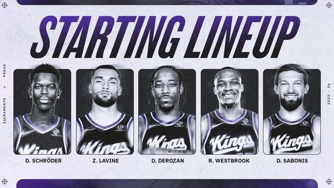 国王首发阵容:控球后卫:施罗德、得分后卫:拉文、小前锋:德罗赞、大前锋:威斯布鲁克、中锋:萨博尼斯